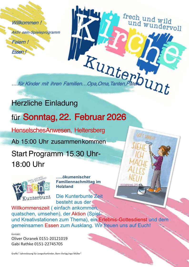 Die Farben stehen für die Gottesdienst- und Veranstaltungsorte: Grün = Schmalenberg / Blau = Geiselberg / Lila = Heltersberg / Gelb = weitere Orte